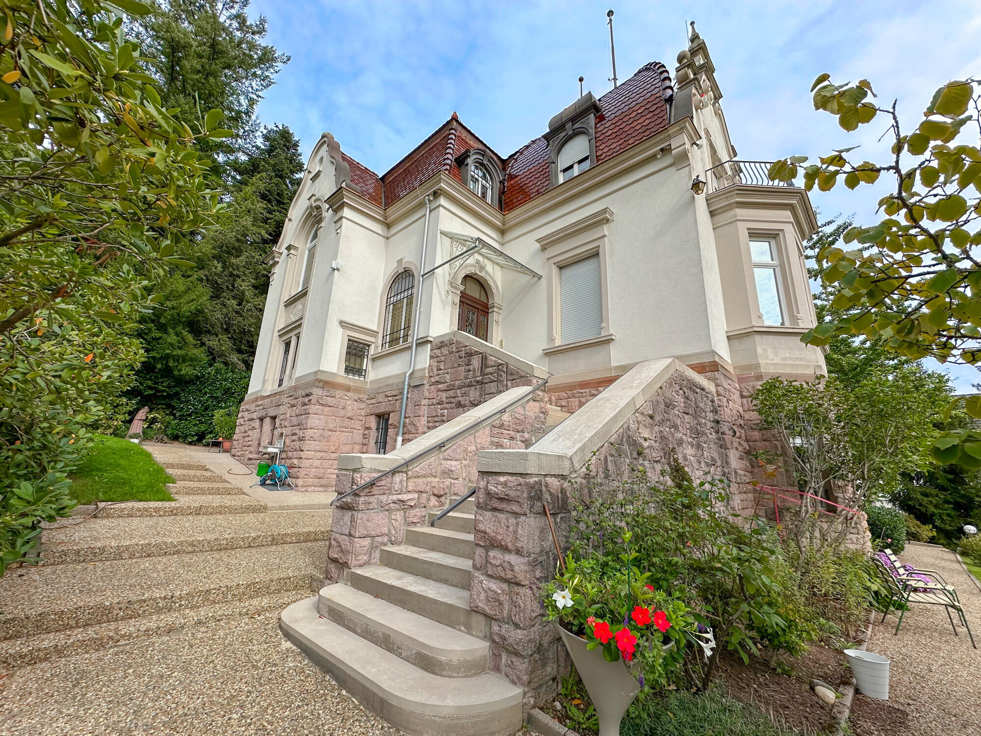 Denkmalgeschützte Jugendstilvilla mit Sandsteinfassade und Bossenquadern. Kuppeldach mit Volutengiebel.